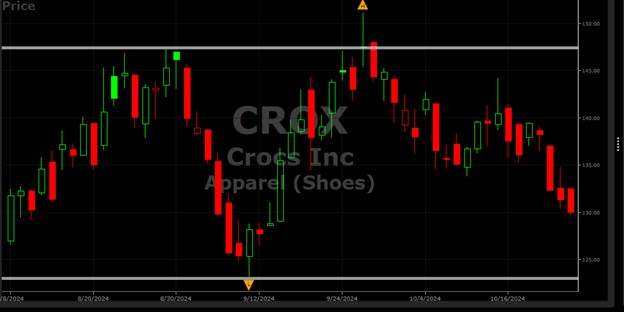 Figure 1 illustrates the price action for Crocs (CROX) from August 8. 2024 through October 24, 2024.  As depicted in the figure, CROX is cycling between a low of $123 and a high of $151.  The two white lines on the graph denote the Support and Resistance lines. The Support line is drawn at $123, and the Resistance line is drawn at $147.